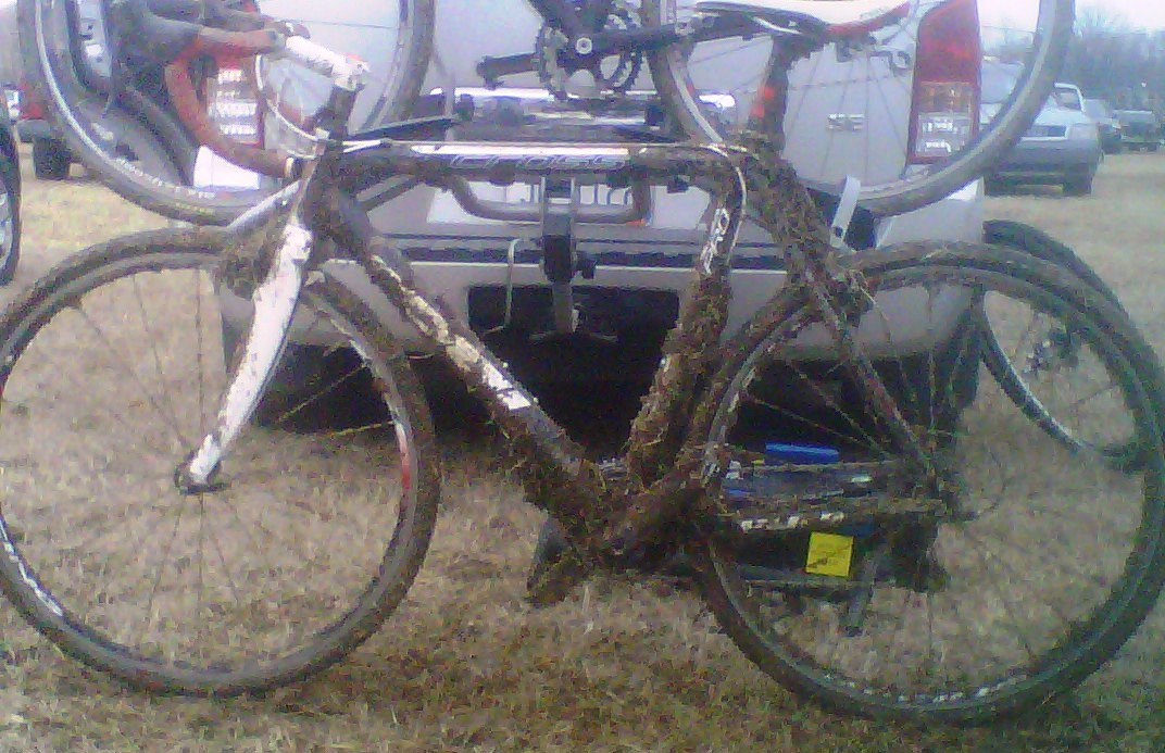 Clarksville Schwinn who did have what we were looking for and offered us a great deal. Nice people, treated us great. We also had dinner with the only other Central-Ohioan racing that weekend, Doug Carraway. Good dinner, great company. We didn't race on Friday but the temps had dropped considerably overnight so that those racing had to deal with frozen ruts in the mud we made the day before. One broken wheel that I saw, one broken bone I heard of in those treacherous conditions. Yow.